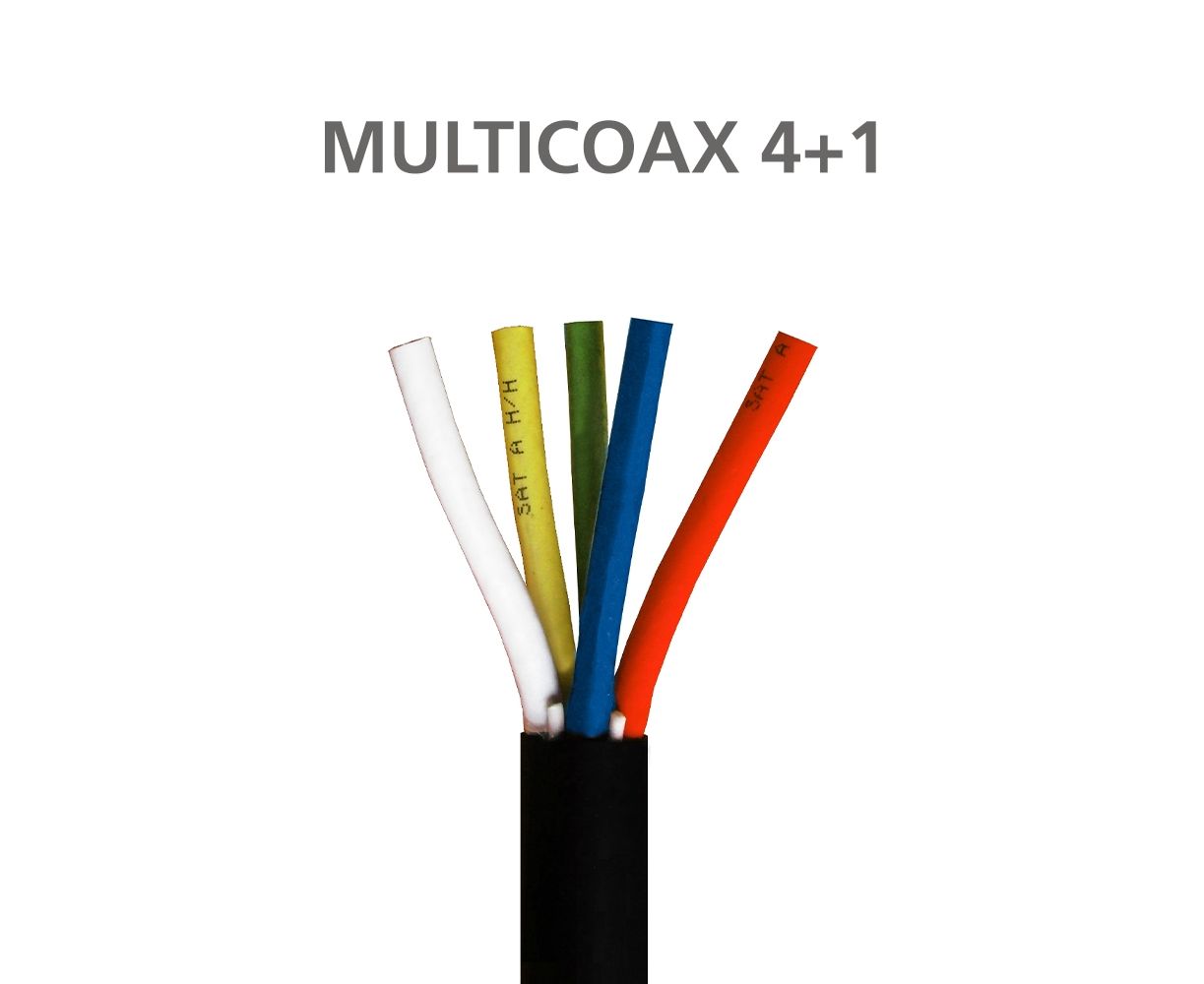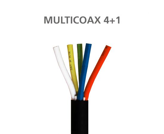Πεντάκλωνο ομοαξονικό καλώδιο, με 5 ομοαξονικά RG6 καλώδια σε ένα ενιαίο, πολύκλωνο καλώδιο, με την ελάχιστη δυνατή διατομή για πολύ εύκολη και διακριτική όδευση. Με 4 ομοαξονικά δορυφορικών πολώσεων (πράσινο, κόκκινο, κίτρινο, μπλέ και 1 ομοαξονικό καλώδιο επίγειου σήματος (άσπρο). Όλα σε 1 καλώδιο, για μέγιστη ευκολία στην εγκατάσταση και αποφυγή προβλημάτων. Εξωτερικό περίβλημα PVC μαύρου χρώματος.