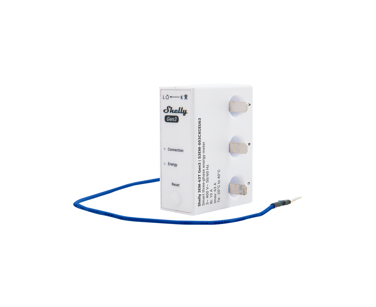 Shelly 3EM-63 Gen3 (The Device) is a compact energy meter designed to monitor either a three-phase system or three independent single-phase circuits. It can work standalone in a local Wi-Fi network, or it can also be operated through cloud home automation services through MQTT, HTTP, and WebSocket. All inbound connections support TLS.