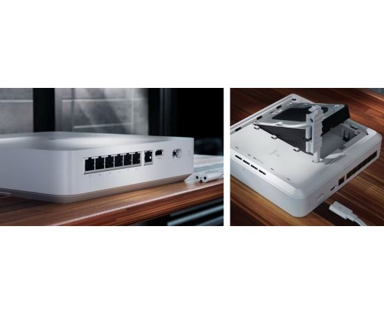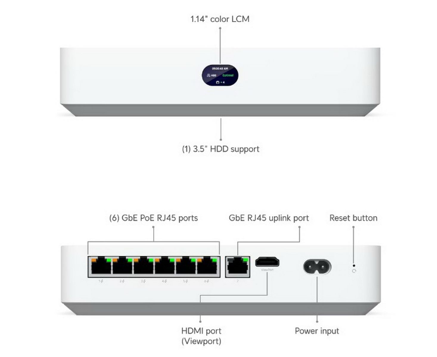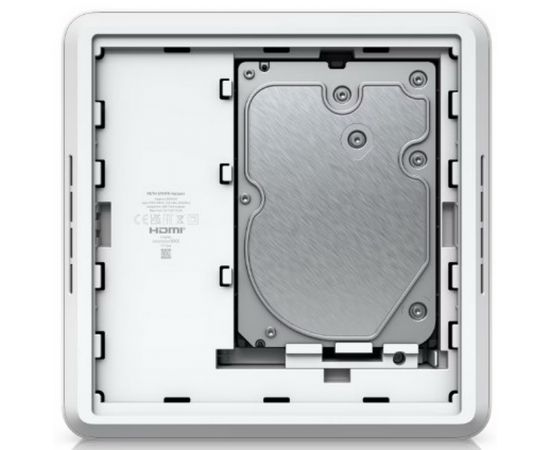 Compact UniFi Protect NVR with 3.5" HDD support, featuring an integrated 6-port PoE switch, integrated HDMI View Port, and a capacity for (6) 4K cameras or (15) Full HD cameras.